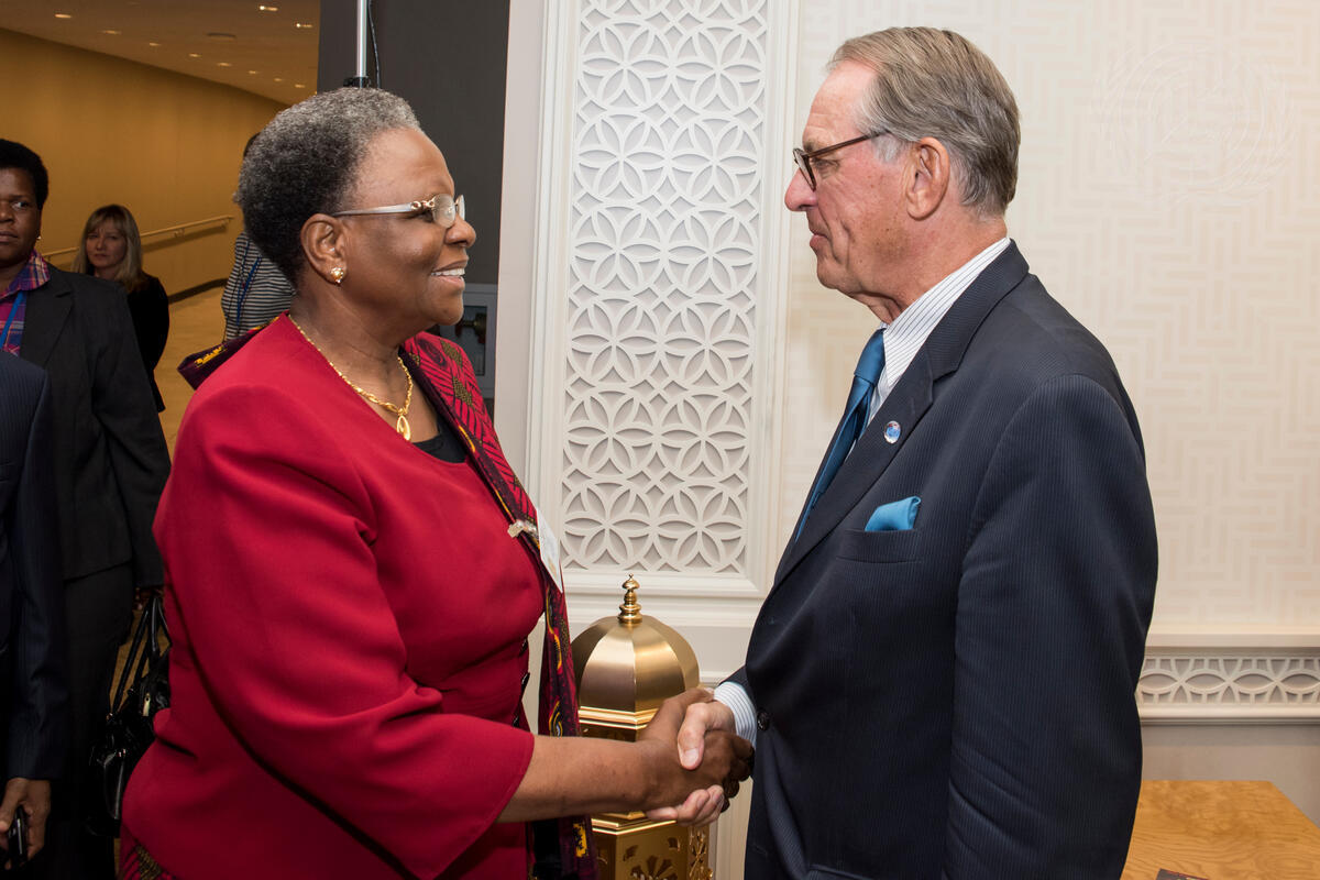 Netumbo Nandi-Ndaitwah (left), Deputy Prime Minister of the Republic of Namibia, shakes hands with Deputy Secretary-General Jan Eliasson.