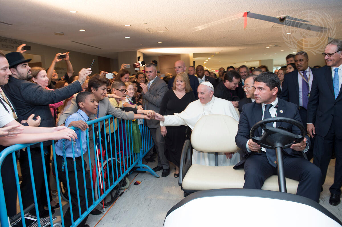 Pope Francis, accompanied by Secretary-General Ban Ki-moon, greets UN staff and their children welcoming him during his visit to United Nations headquarters.
