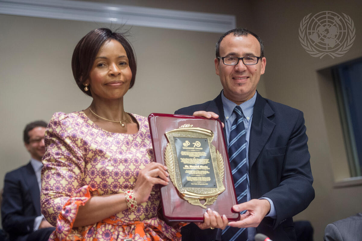 Maite Nkoana-Mashabane (left), Minister for International Relations and Cooperation of South Africa and Chair of the 39th Annual Meeting of the Ministers for Foreign Affairs of the Group of 77, presents Mourad Ahmia, Executive Secretary of the Group of 77 Secretariat, with a plaque at the Group's Ministerial Meeting.