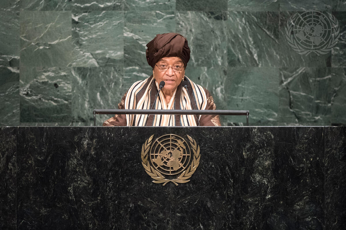 Ellen Johnson Sirleaf, President of the Republic of Liberia, addresses the United Nations summit for the adoption of the post-2015 development agenda.
