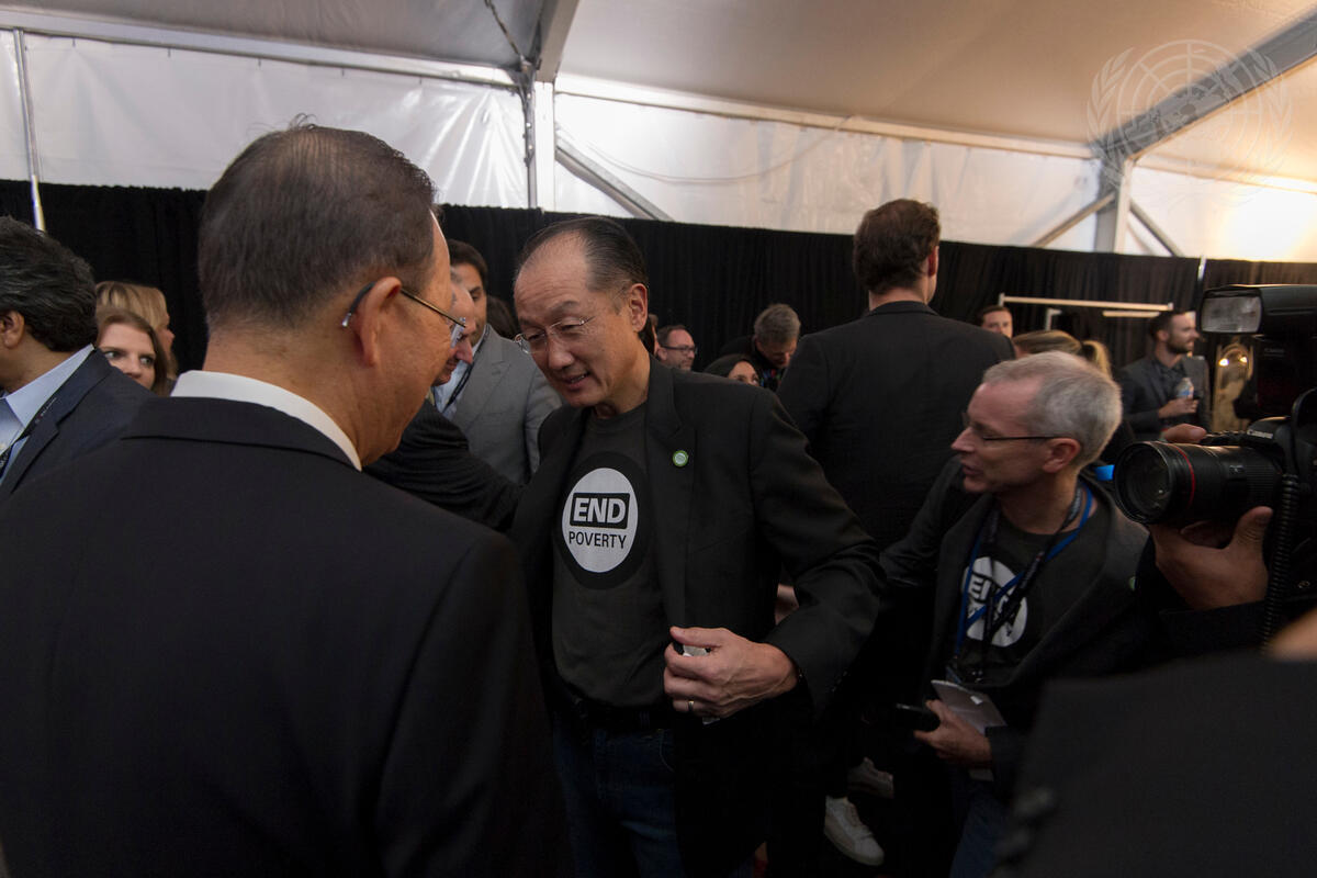 Jim Yong Kim, President of the World Bank Group, shows Secretary-General Ban Ki-moon (left) his ""End Poverty"" tee shirt at the Global Citizen Festival in New York's Central Park this evening. The festival is taking place on the second day of the UN's Sustainable Development Summit 2015 at which world leaders adopted an ambitious new sustainable development agenda. The plan, titled ""Transforming our world: the 2030 Agenda for Sustainable Development"", includes 17 goals that will help to end extreme poverty, fight inequality and justice and fix climate change over the next 15 years.