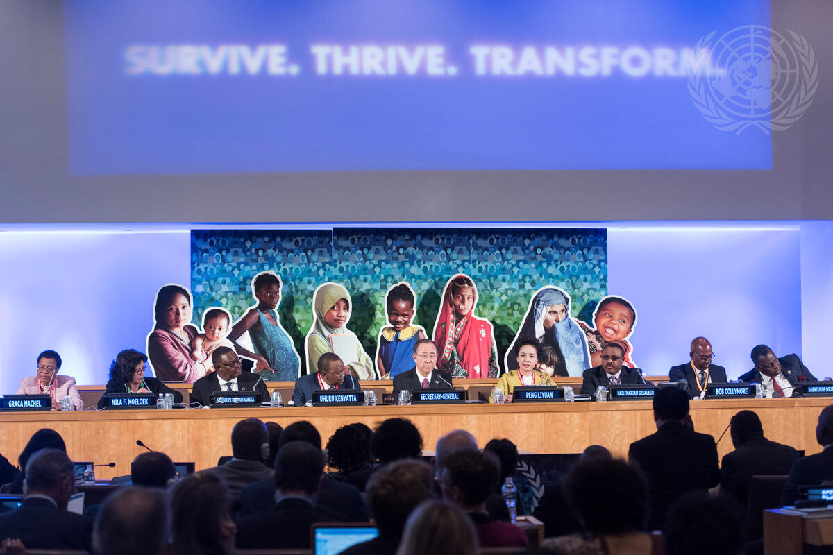 Peng Liyuan (fourth from right), First Lady of the People's Republic of China, speaks at today's Every Woman Every Child event, where Secretary-General Ban Ki-moon launched a new ""Global Strategy for Women’s, Children’s and Adolescents’ Health"". The strategy includes 25 billion dollars in initial commitments from world leaders to help end preventable deaths of women, children and adolescents, and ensure their health and well-being. Also speaking at today's event are, from left: Graça Machel, former First Lady of South Africa and Founder of the Graça Machel Trust; Nila Moeloek, Minister of Health of Indonesia; Arthur Peter Mutharika, President of the Republic of Malawi; Uhuru Kenyatta, President of the Republic of Kenya; Secretary-General Ban Ki-moon; Hailemariam Desalegn, Prime Minister of the Federal Democratic Republic of Ethiopia; Bob Collymore, CEO, Safaricom; and Babatunde Osotimehin, Executive Director of the UN Population Fund (UNFPA).