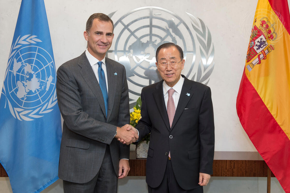 Secretary-General Ban Ki-moon (right) meets with King Felipe VI of Spain.