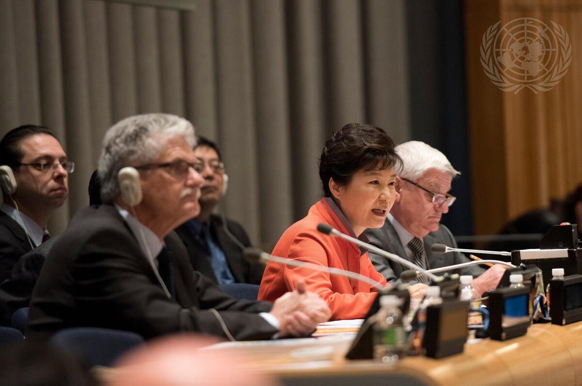 Park Geun-hye (second from right), President of the Republic of Korea, addresses the Interactive Dialogue on “Building effective, accountable and inclusive institutions to achieve sustainable development”. The event was co-chaired by President Park and Michelle Bachelet Jeria, President of Chile.