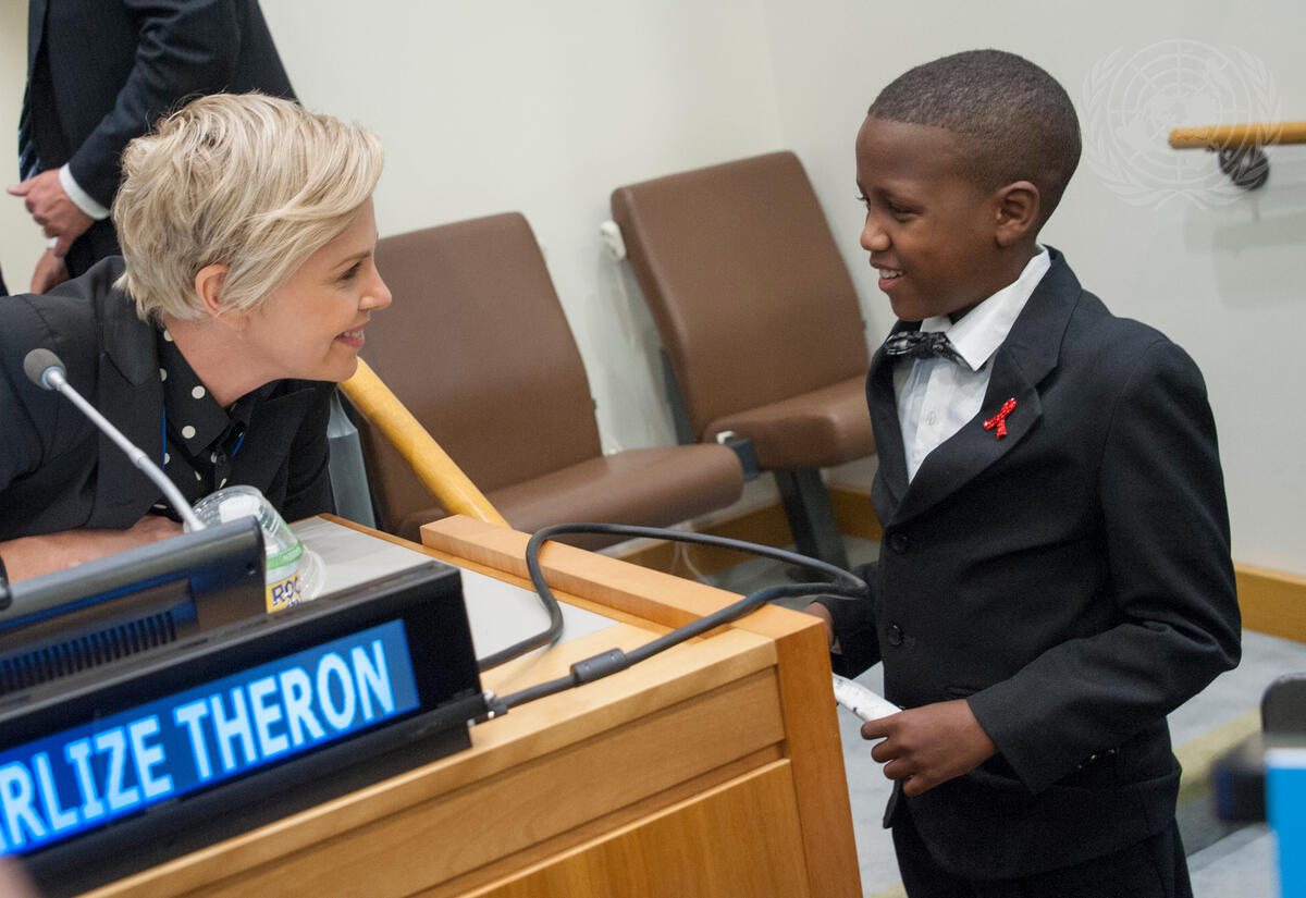 Charlize Theron, UN Messenger of Peace and Founder of the Charlize Theron Africa Outreach Project, greets Elijah Zachary Lemein, youth and civil representative from Kenya, at the High-Level UNAIDS event, ""Action: Implementation - Ending the AIDS epidemic by 2030 - Shaping new models and means of implementation"".