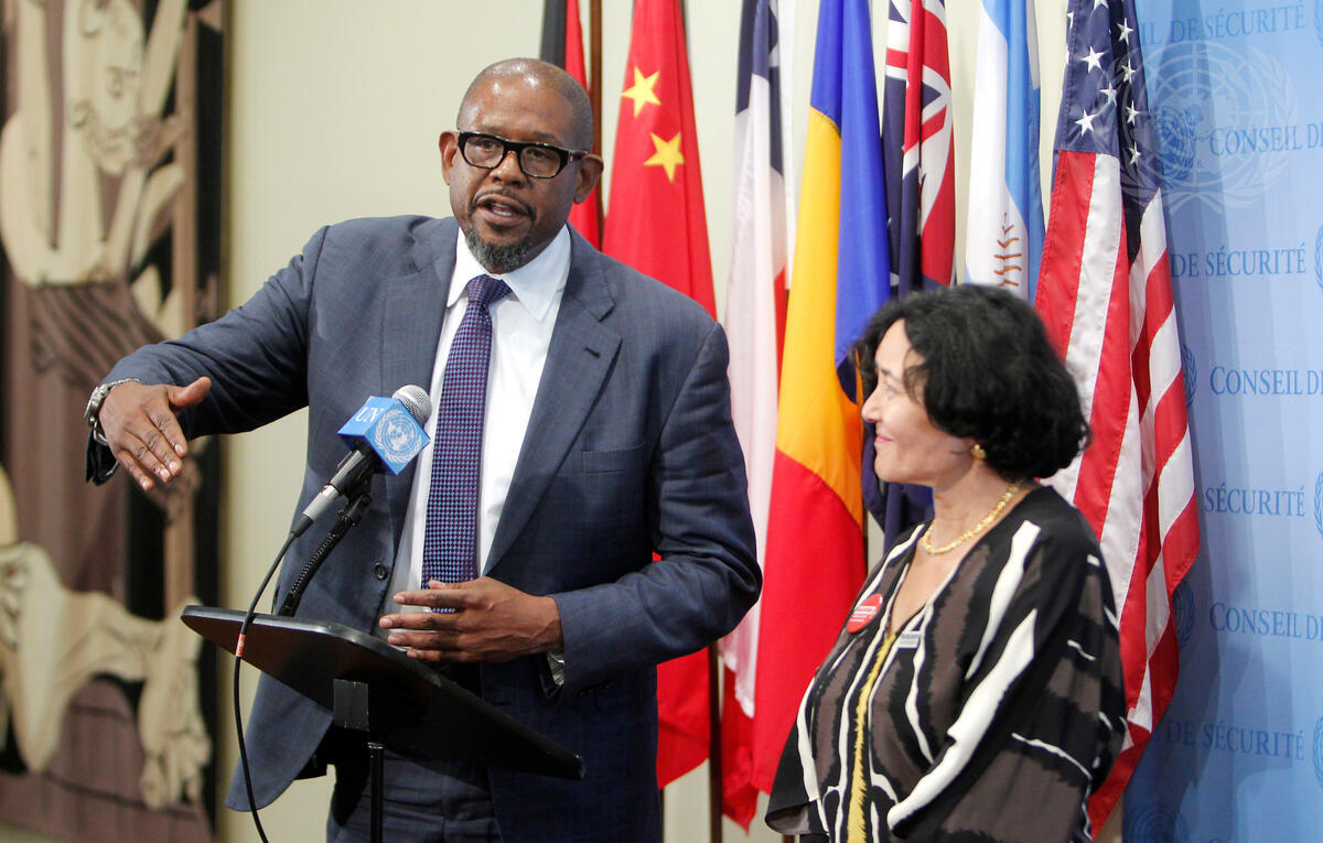 Forest Whitaker (left), UNESCO Goodwill Ambassador for Peace and Reconciliation, speaks to the media after briefing the Security Council on his latest trip to South Sudan. At the Security Council meeting, which was focused on the Secretary-General's latest report on children and armed conflict, Mr. Whitaker reported on the child soldiers he saw in the cities wearing military uniforms and carrying guns, and suggested that, ""We may take a child out of an army, but unless we do more for him – help him re-enter society, enrol him in a good school, teach him a useful trade – we have not set him free"". To the right is Leila Zerrougui, Special Representative for Children and Armed Conflict.
