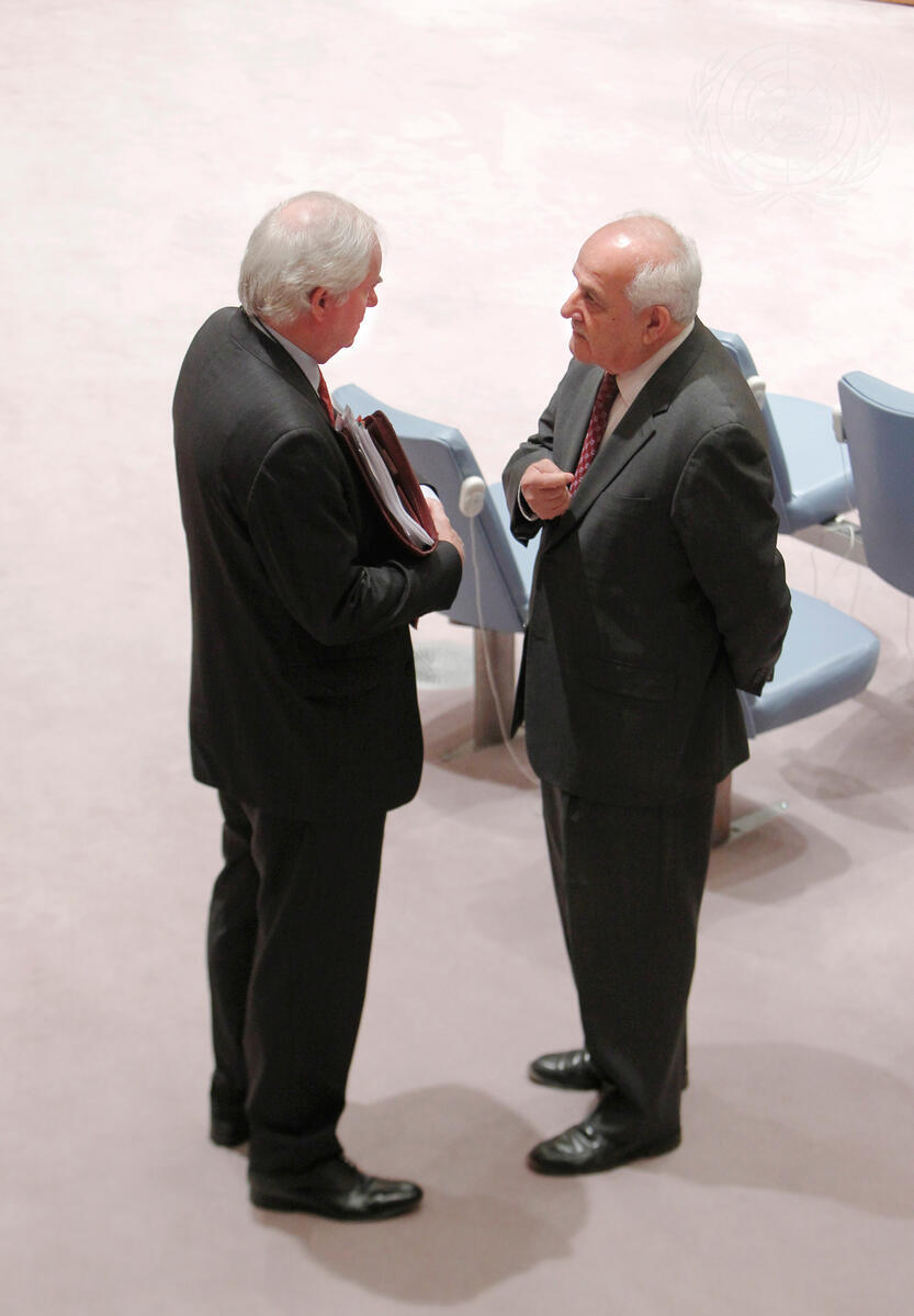 Riyad H. Mansour (right), Permanent Observer of the State of Palestine to the UN, with Mark Lyall Grant, Permanent Representative of the United Kingdom, in the Security Council Chamber.