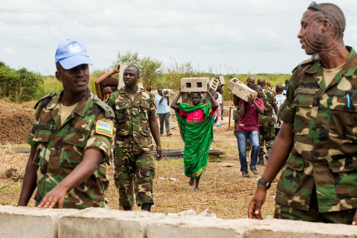 Community members join UNMISS Peacekeepers in community work, or ""Umuganda"", helping build a new school in Kapuri, a town close to the capital of Juba in the Central Equatoria State of South Sudan.