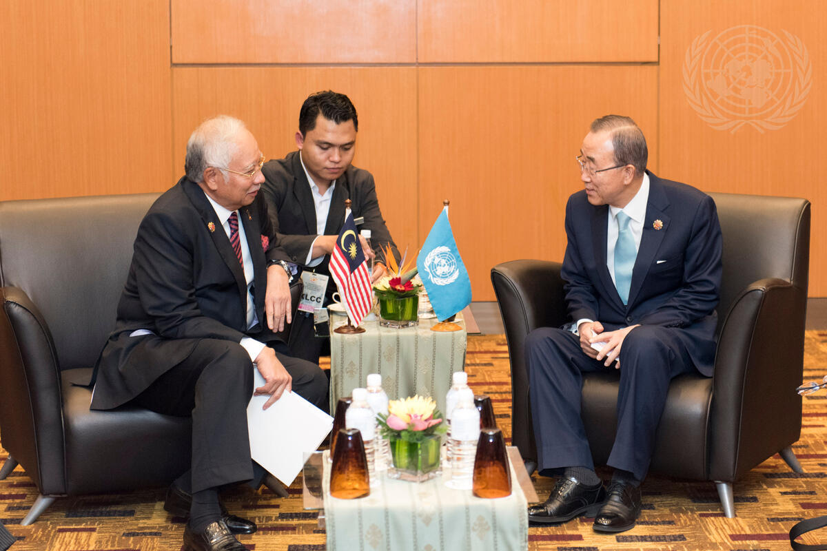 Secretary-General Ban Ki-moon (right) meets with Dato' Sri Mohd Najib Tun Abdul Razak, Prime Minister of Malaysia, on the sidelines of the seventh Association of Southeast Asian Nations (ASEAN)-United Nations Summit and the tenth East Asia Summit, both being held this weekend in Kuala Lumpur, Malaysia.