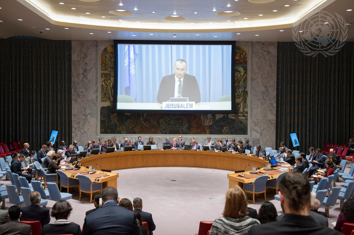 A wide view of the Security Council meeting on the situation in the Middle East, including the Palestinian question. The Council was briefed via video teleconference by Nickolay Mladenov, UN Special Coordinator for the Middle East Peace Process and Personal Representative of the Secretary-General to the Palestine Liberation Organization and the Palestinian Authority.
