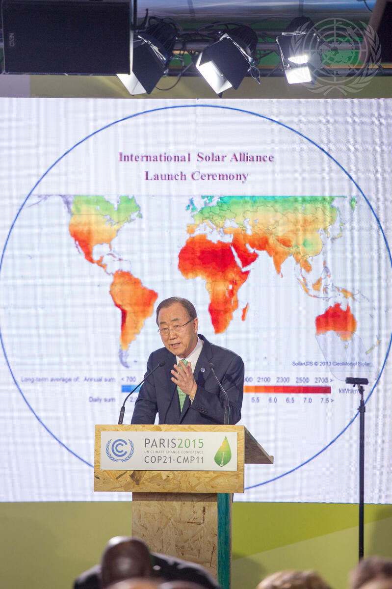 Secretary-General Ban Ki-moon speaks at the launch of the International Agency for Solar Technologies and Applications (Iasta) during the UN Climate Change Conference (COP 21) in Paris.