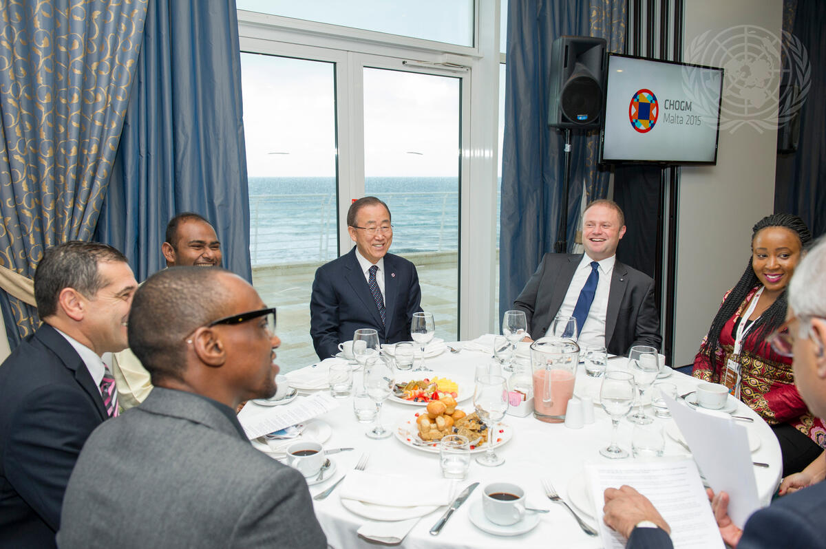 Secretary-General Ban Ki-moon (centre) participates in a Breakfast Dialogue between Commonwealth Heads of Government and Youth Leaders at the 2015 Commonwealth Heads of Government Meeting (CHOGM), taking place in Malta, 27-29 November. To the right of Mr. Ban is Joseph Muscat, Prime Minister of Malta.