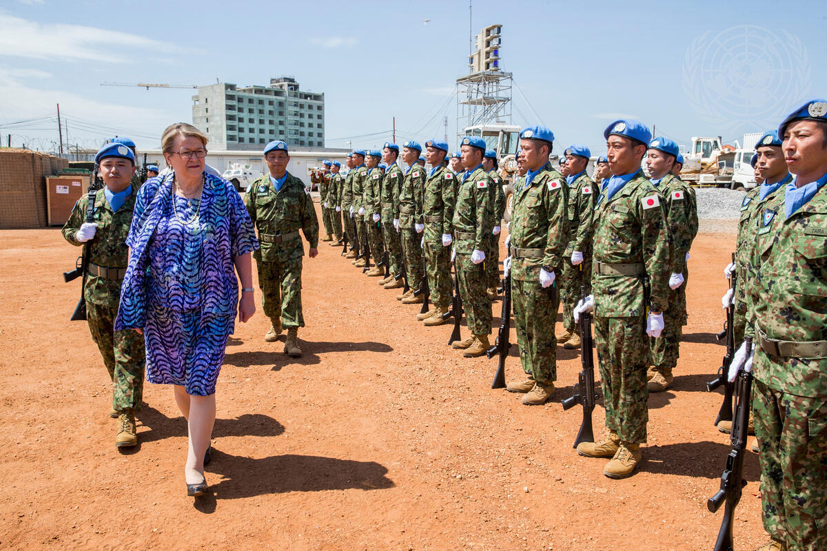 Ellen Margrethe Løj (left), Special Representative of the Secretary-General and Head of UNMISS, reviews the troops in formation.