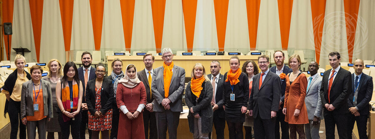 Mogens Lykketoft (centre left), President of the seventieth session of the Assembly, poses for a group photo with participants on the occassion of the International Day for the Elimination of Violence against Women.