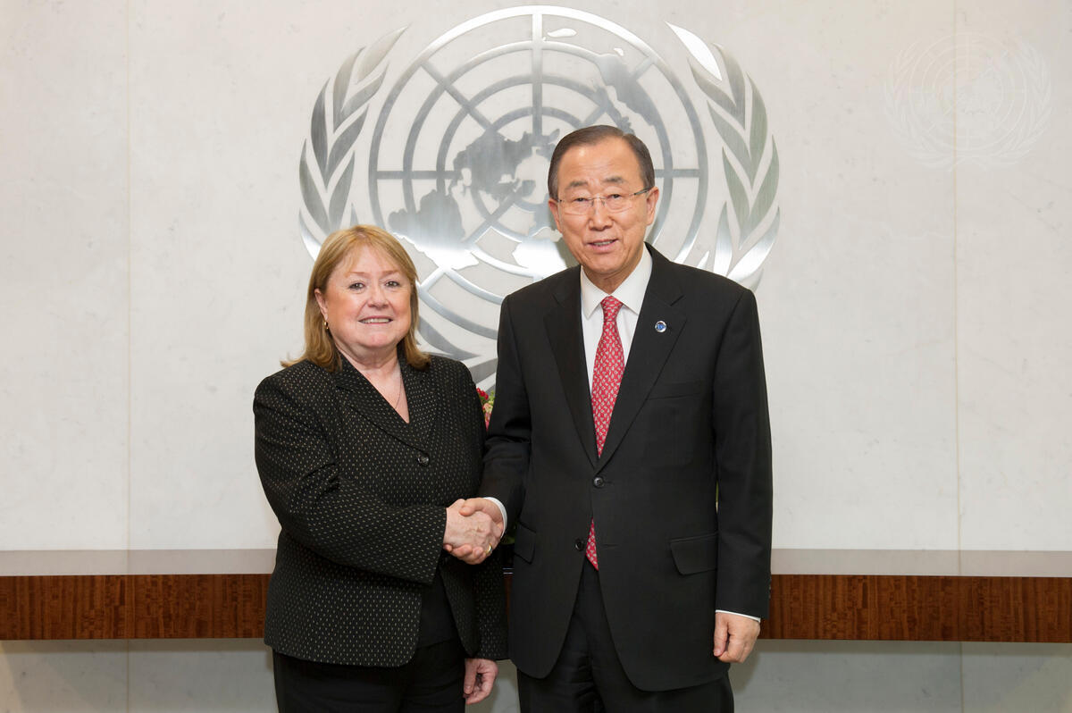 Susan Malcorra (left), outgoing Chef de Cabinet to the Secretary-General, pays a farewell call on Secretary-General Ban Ki-moon.
