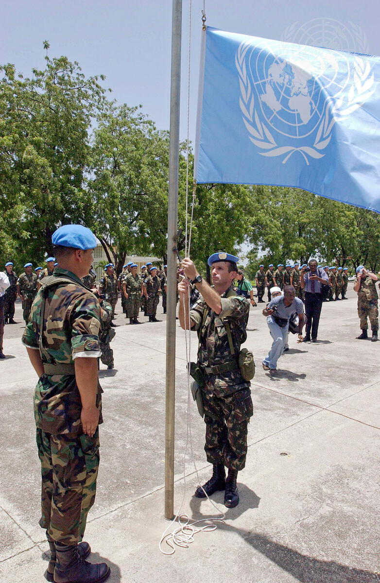 A United Nations soldier raises the United Nations flag during the opening ceremony as the United Nations Stabilization Mission in Haiti (MINUSTAH) opens its mission in Port-au-Prince.