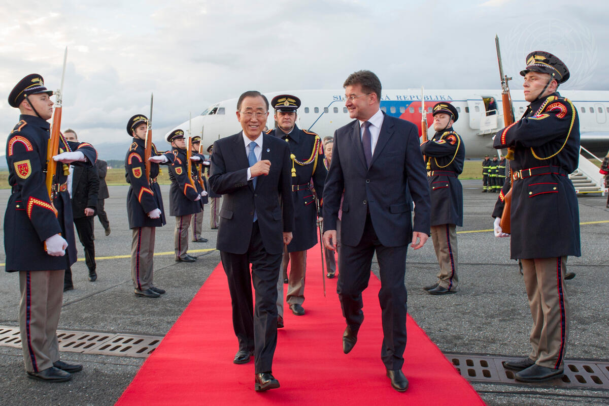 Secretary-General Ban Ki-moon (centre left) arrives in Poprad, Slovakia.