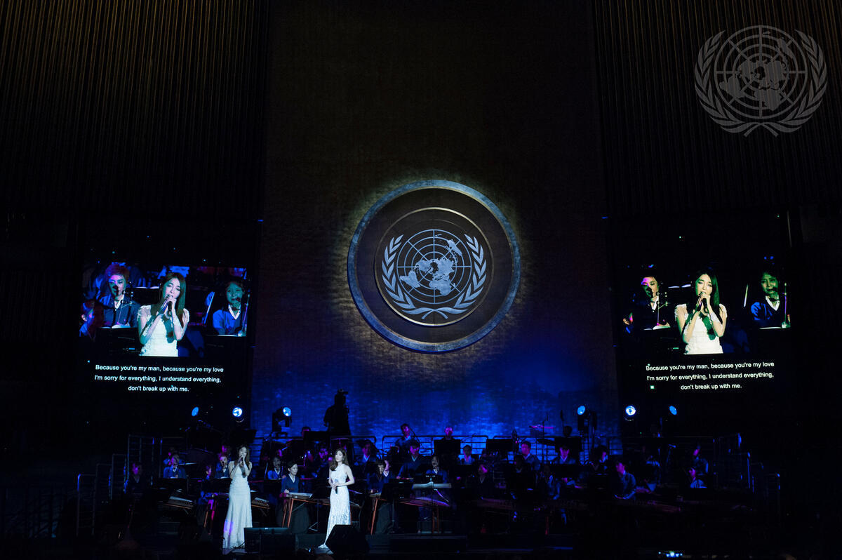 To mark the seventieth anniversary of the founding of the United Nations, a commemorative concert was held on Friday, 23 October 2015, in the UN General Assembly Hall. Organized by the UN Department of Public Information in collaboration with the Permanent Mission of the Republic of Korea to the United Nations and the Korean Broadcasting System (KBS), the concert featured the KBS Traditional Music Orchestra, under the direction of conductor Lee Jun-ho and accompanied by Kim Hae-sook, renowned master of the twelve-string gayageum. Special guest performers included UN Messenger of Peace and pianist Lang Lang; K-pop duo Davichi; and the Harlem Gospel Choir.
