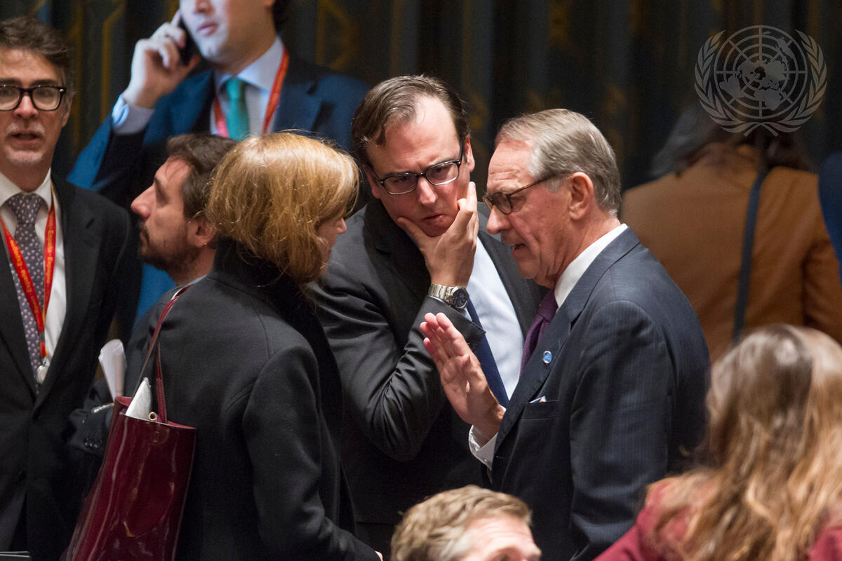 Deputy Secretary-General Jan Eliasson (centre right) speaks with Samantha Power (centre left), United States Permanent Representative to the UN, at the Security Council open debate on situation in the Middle East, including the Palestinian question.