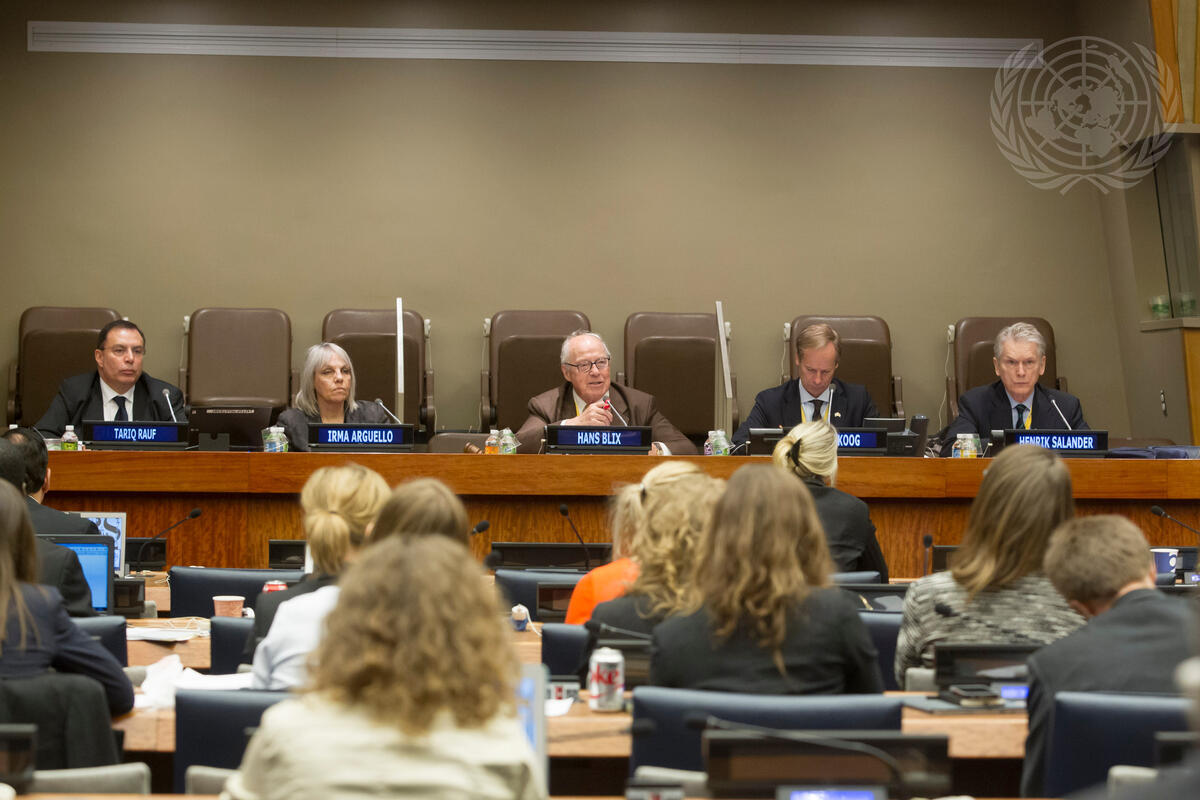 Hans Blix (centre on dais), former head of the UN Monitoring, Verification and Inspection Commission (UNMOVIC) and the International Atomic Energy Agency (IAEA), speaks at a high-level panel on “Perspectives on Disarmament and International Security: The continued relevance of the recommendations of the Blix Commission’s report Weapons of Terror”. The report, “Weapons of Terror: Freeing the World of Nuclear, Biological and Chemical Arms,” by the Weapons of Mass Destruction (WMD) Commission, was presented in 2006 to then Secretary-General Kofi Annan by Dr. Blix, who chaired the WMD Commission.