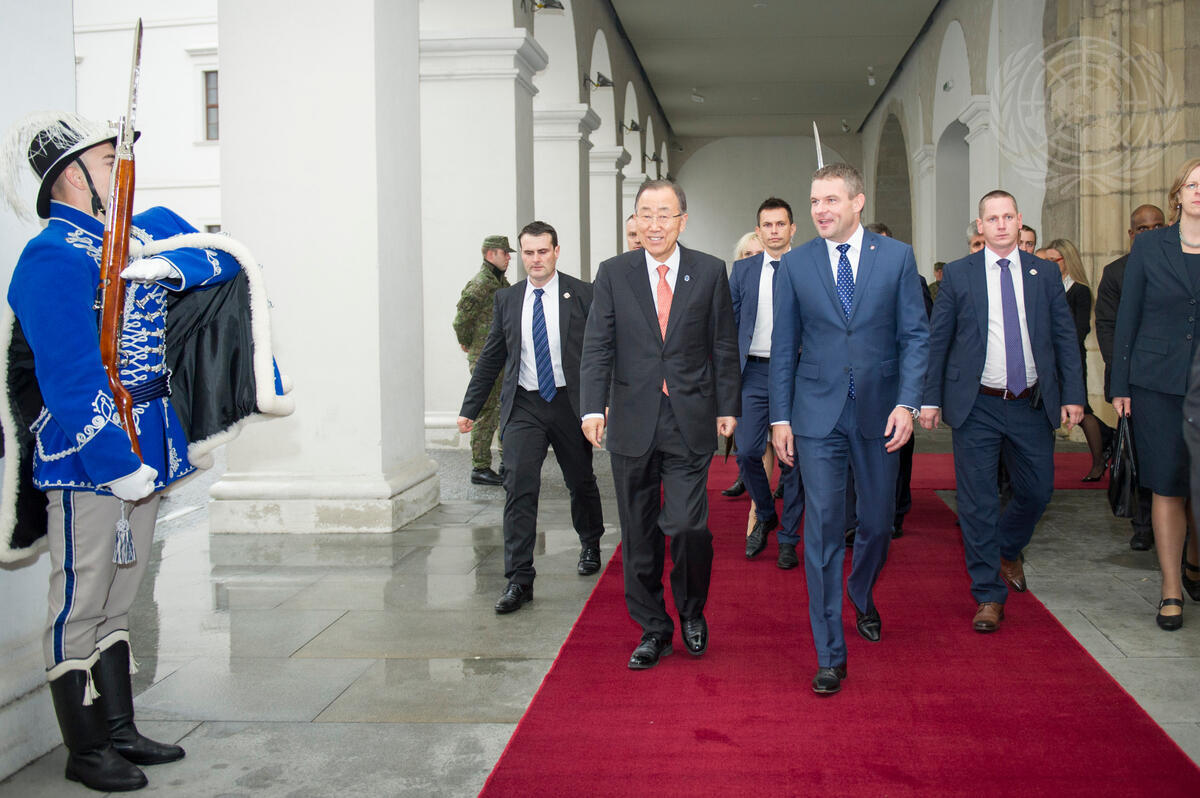 Secretary-General Ban Ki-moon (centre left) meets with Peter Pellegrini (centre right), Speaker of the National Council of the Slovak Republic, in Bratislava.