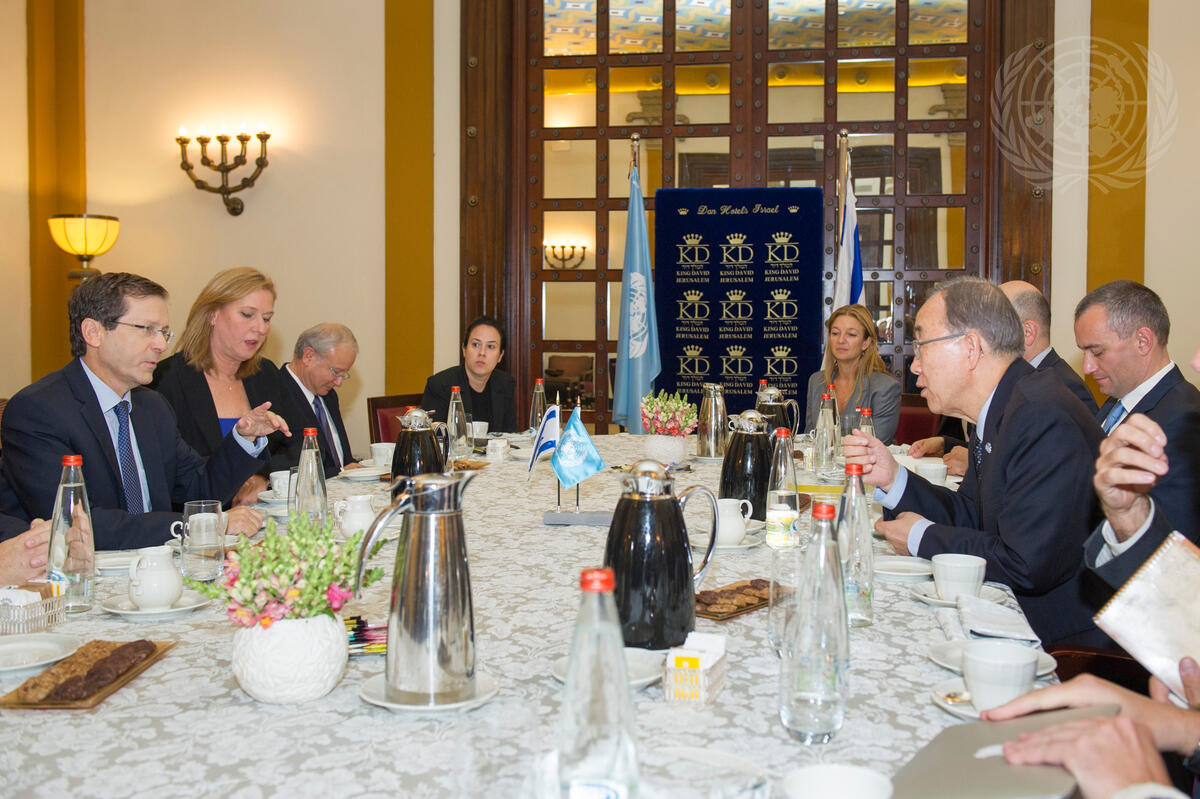 Secretary-General Ban Ki-moon meets with Isaac Herzog (left), Leader of the Zionist Union opposition party of Israel; and Tzipi Livni (second from left), former Minister of Justice of Israel.