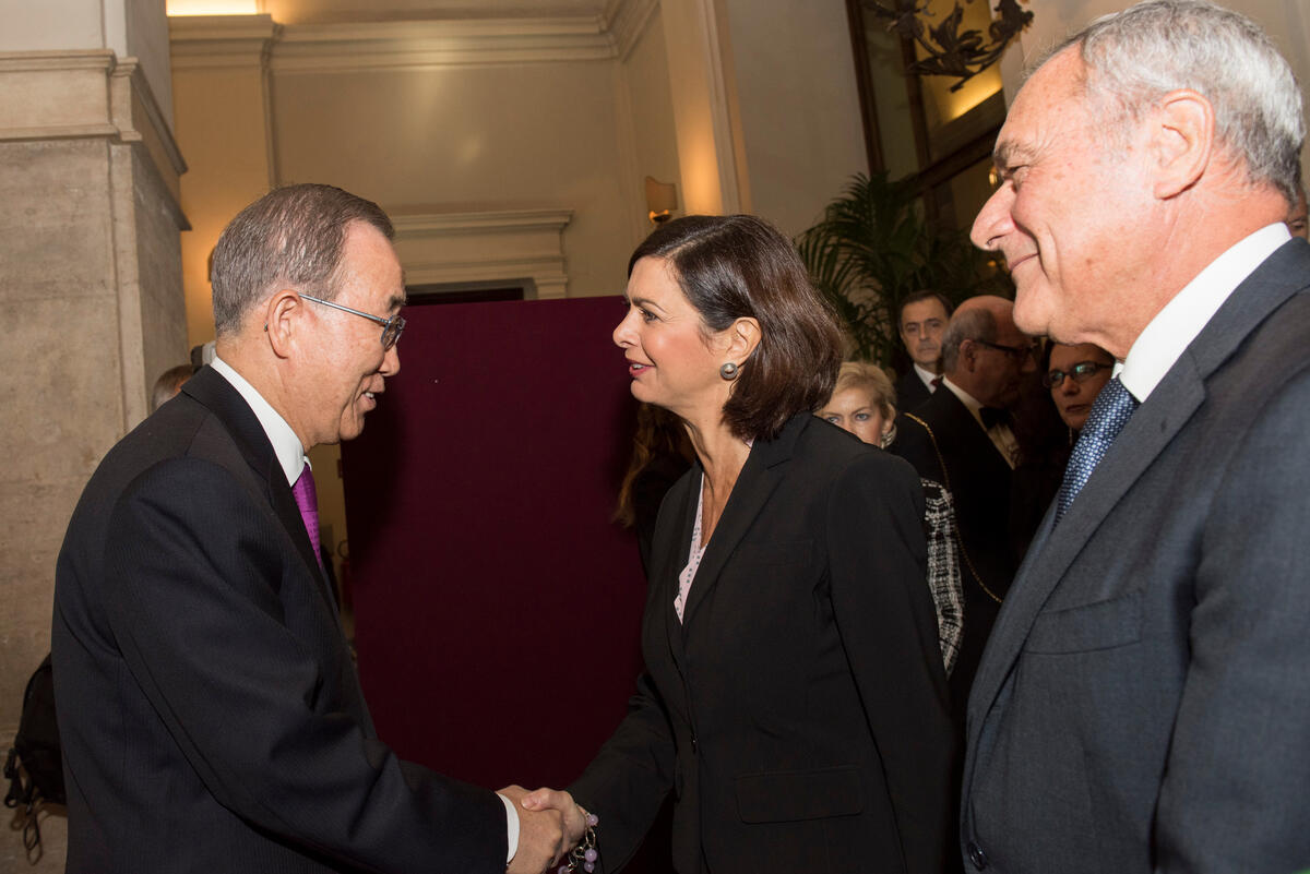 Caption Description Secretary-General Ban Ki-moon (left) is welcomed by  Laura Boldrini (centre), President of the Chamber of Deputies of Italy, and Pietro Grasso (right), President of the Senate, on his arrival at the Palazzo Montecitorio to address the Italian Parliament.