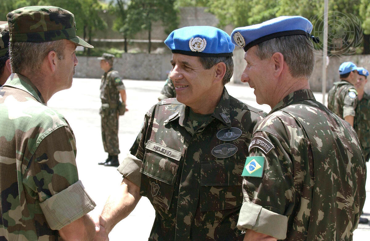 Lieutenant-General Augusto Heleno Ribeiro Pereira form Brazil (centre), Force Commander of the United Nations Stabilization Mission in Haiti (MINUSTAH), conferring with some United Nations soldiers during the opening ceremony in Port-au-Prince.