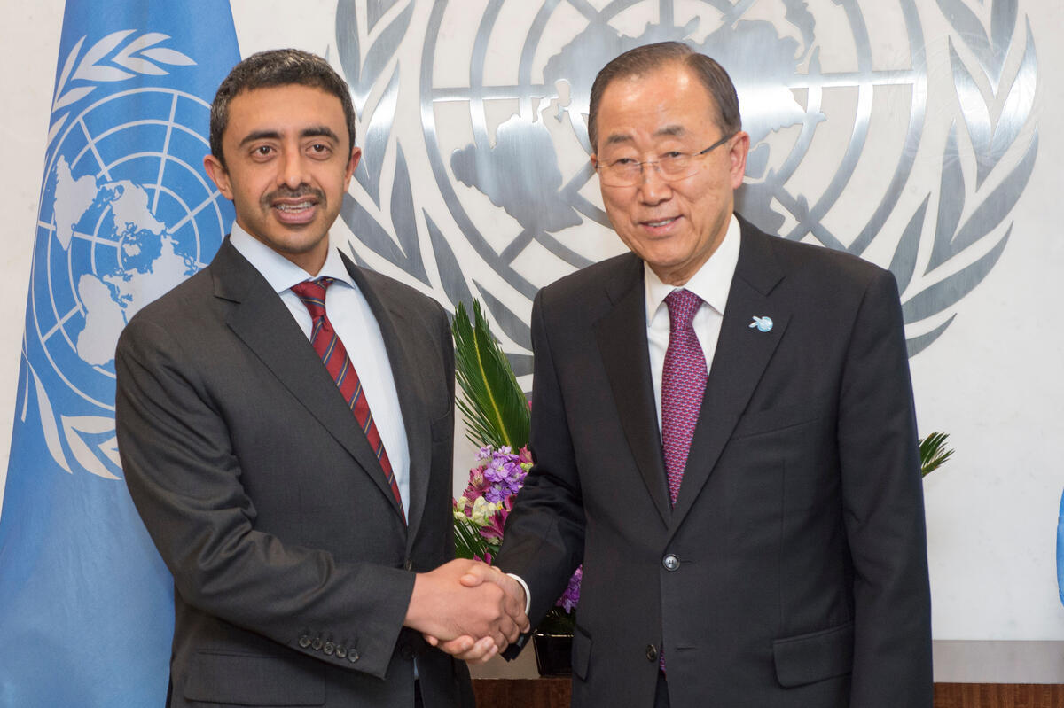 Secretary-General Ban Ki-moon (right) meets with Sheikh Abdullah Bin Zayed Al Nahyan, Minister for Foreign Affairs of the United Arab Emirates, on the margins of the general debate of the General Assembly’s seventieth session.