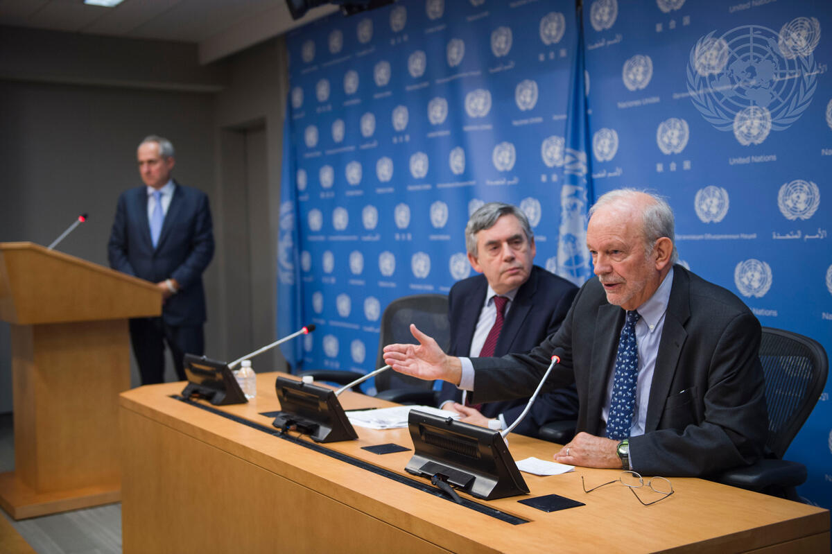 Anthony Lake (right), Executive Director of the United Nations Children's Fund (UNICEF), jointly addresses a press conference with Gordon Brown (centre), United Nations Special Envoy for Global Education. The briefing was moderated by Stéphane Dujarric (left), Spokesperson for the Secretary-General.