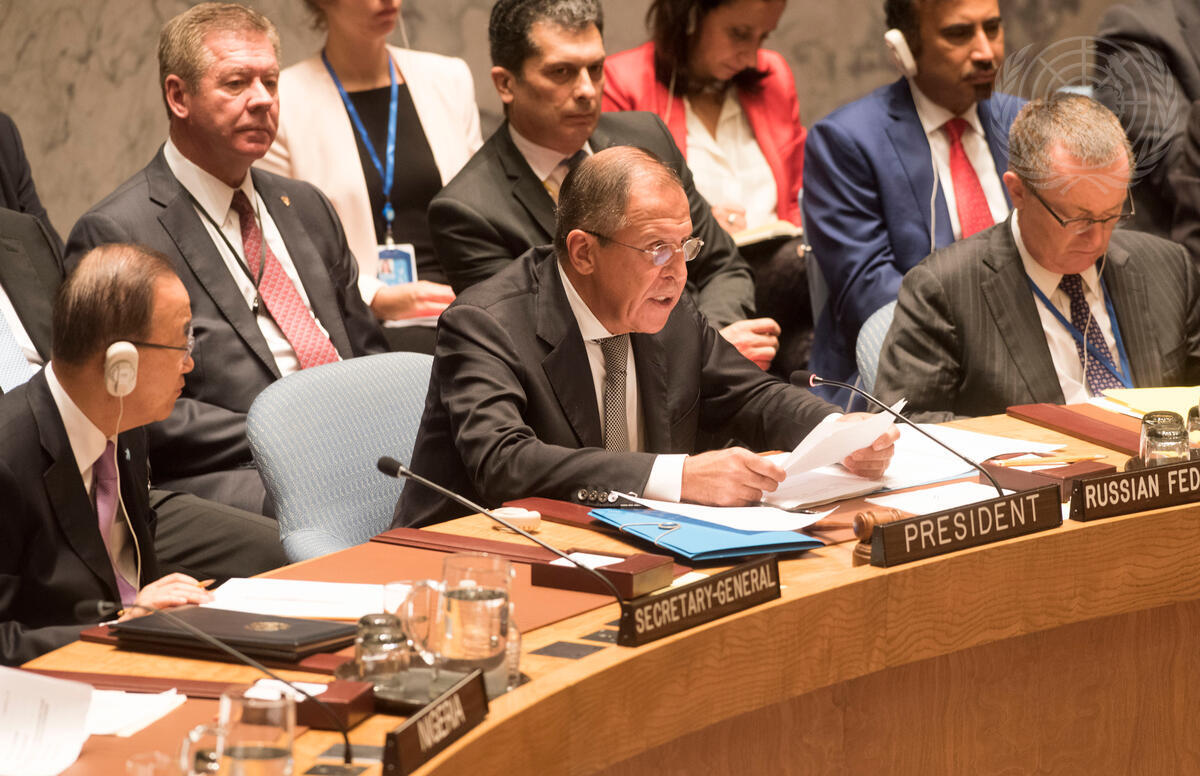 Sergey V. Lavrov (centre), Minister for Foreign Affairs of the Russian Federation, speaks at today's Ministerial Level Security Council meeting on the maintenance of international peace and security in the Middle East and North Africa and countering terrorist threats in the region. Also present is Secretary-General Ban Ki-moon (left) and Jeffrey Feltman, Under-Secretary-General for Political Affairs.