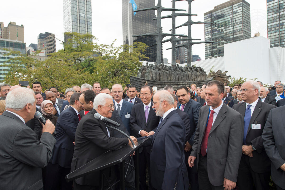 Mahmoud Abbas (centre), President of the State of Palestine, greets Ibrahim Al-Jaafari, Minister for Foreign Affairs of Iraq, at today's ceremony to raise the flag of the State of Palestine for the first time at UN Headquarters in New York. Also pictured is Secretary-General Ban Ki-moon (centre, in purple tie) and Riyad H. Mansour (bottom-left, with microphone), Permanent Observer of Palestine to the UN.
