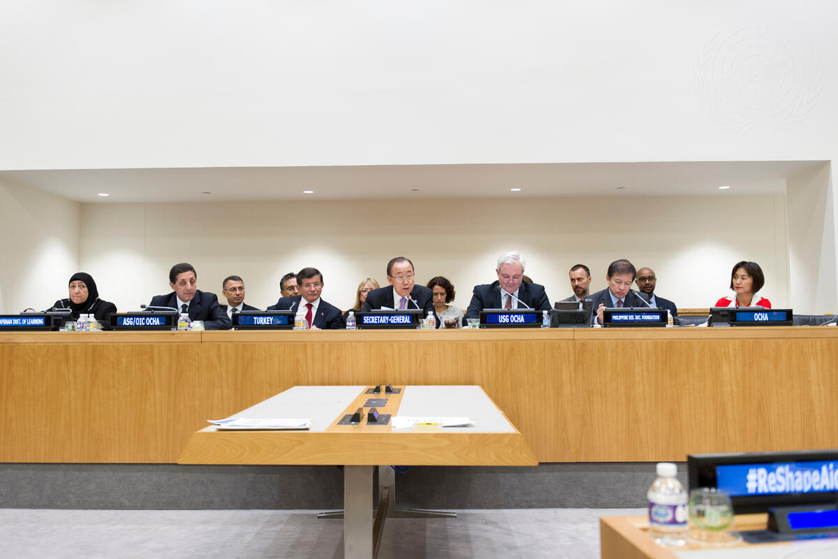 Also speaking on the panel are, from left: Sakena Yacoobi, Foudner and Chief Executive Officer of the Afghan Institute of Learning (AIL); Hesham Youssef, Assistant Secretary-General for Humanitarian Affairs for the Organisation of Islamic Cooperation (OIC); Ahmet Davutoglu, Prime Minister of Turkey; Stephen O'Brien, Under-Secretary-General for Humanitarian Affairs and Emergency Relief Coordinator; and Rene 'Butch' Meily, President of the Philippine Disaster Recovery Foundation (PDRF).
