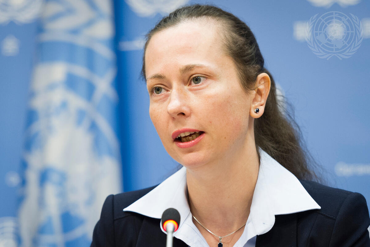 Elzbieta Karska, Chairperson of the United Nations expert group on the use of mercenaries, addresses a press conference. The expert group earlier convened a discussion at UN headquarters in New York to address the issue of the increasing activity of foreign fighters – particularly towards understanding their motivations – and its impact on human rights.