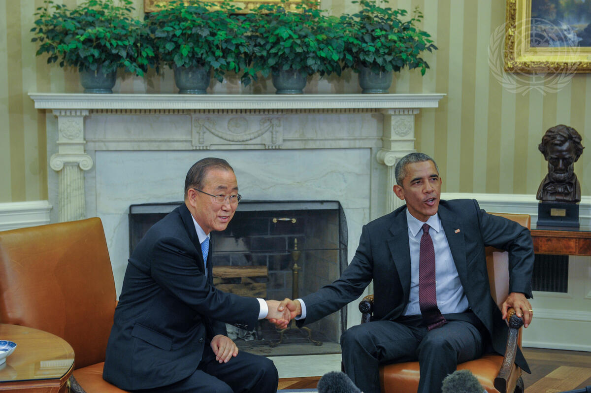 Secretary-General Ban Ki-moon (left) meets with Barack Obama, President of the United States, in the Oval Office in Washington, D.C.