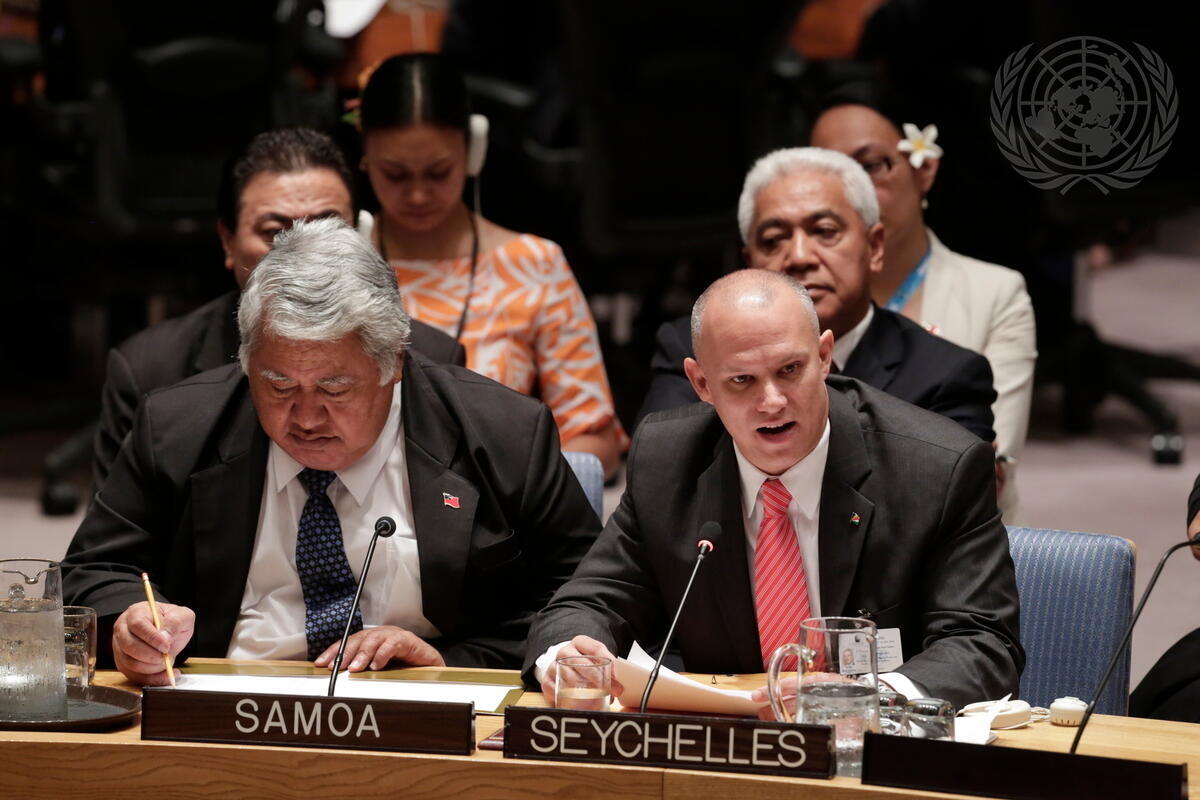 Caption Description Jean-Paul Adam (right), Minister of Finance of the Republic of Seychelles, addresses the Security Council open debate on the subject, “Maintenance of international peace and security: Peace and security challenges facing small island developing States”. At left is Tuilaepa Sailele Malielegaoi, Prime Minister and Minister for Foreign Affairs and Trade of the Independent State of Samoa.