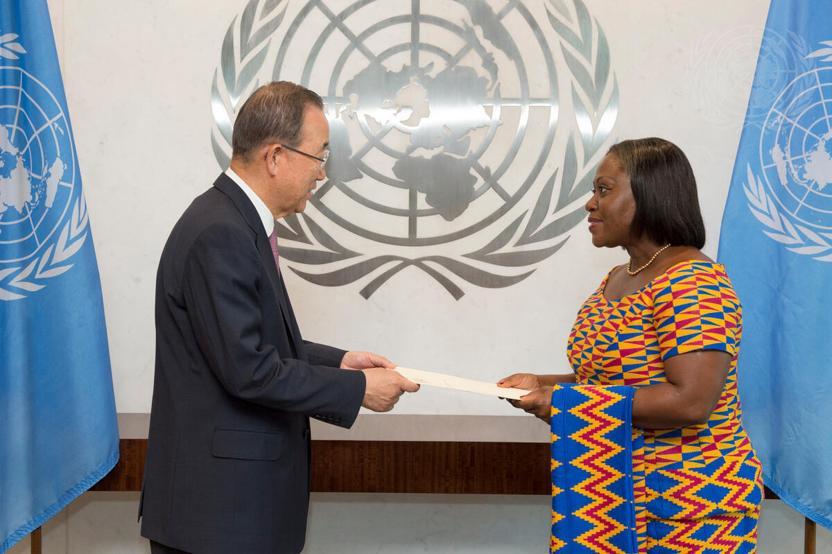 Martha Ama Akyaa Pobee (right), new Permanent Representative of Ghana to the United Nations, presents her credentials to Secretary-General Ban Ki-moon.