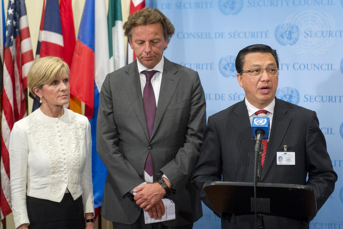 Liow Tiong Lai (right), Minister of Transport of Malaysia, speaks to journalists, following the Security Council meeting. Pictured with him: Julie Bishop (left), Minister for Foreign Affairs of Australia; and Albert Koenders, Minister for Foreign Affairs of the Kingdom of the Netherlands.