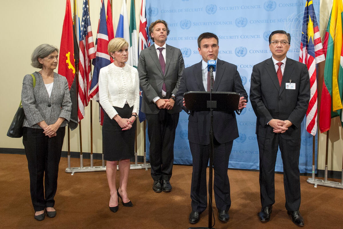 Pavlo Klimkin (centre right), Minister for Foreign Affairs of Ukraine, speaks to journalists, following the Security Council meeting. Pictured with him (from left): Bénédicte Frankinet, Permanent Representative of Belgium to the UN; Julie Bishop, Minister for Foreign Affairs of Australia; Albert Koenders, Minister for Foreign Affairs of the Kingdom of the Netherlands; and Liow Tiong Lai, Minister of Transport of Malaysia.