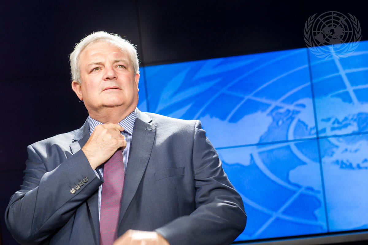 Stephen O'Brien, Under-Secretary-General for Humanitarian Affairs and Emergency Relief Coordinator, in UNTV studio to give an interview for the UN News and Media Division's news outlets.