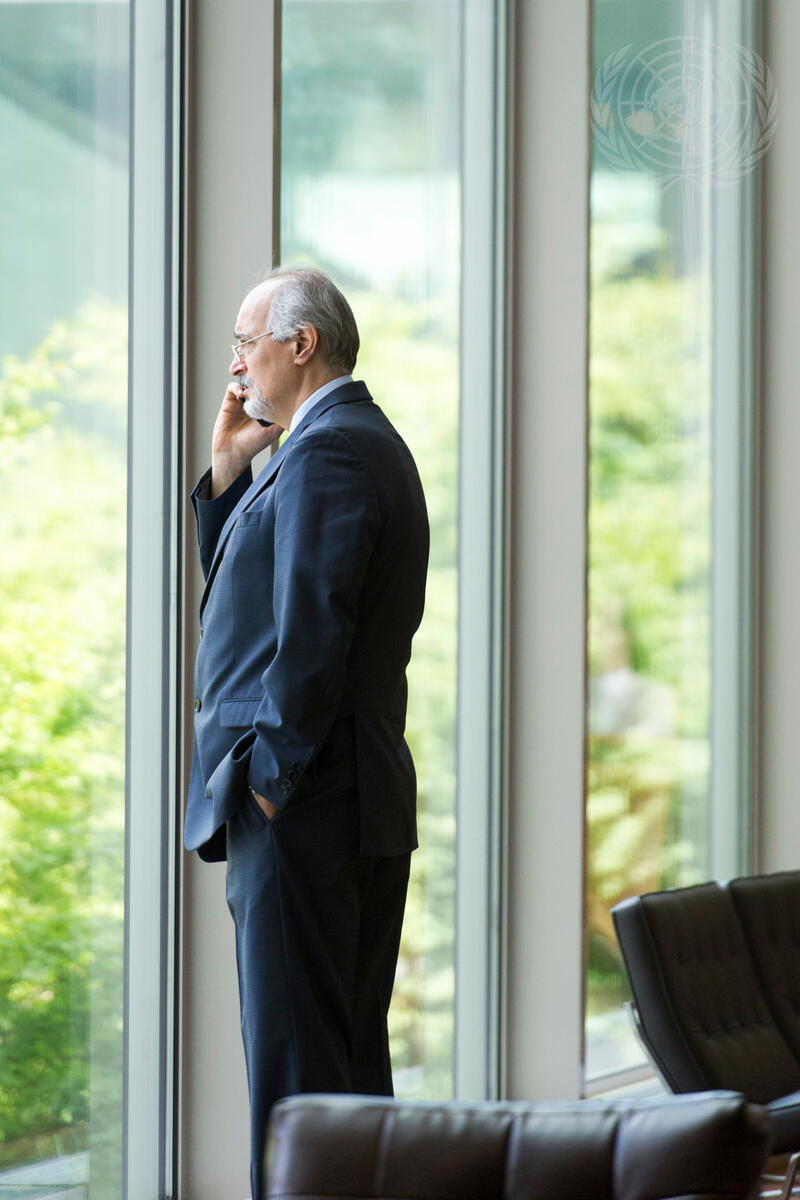 Bashar Ja’afari, Permanent Representative of the Syrian Arab Republic to the UN, on the phone, following a closed-door Security Council meeting on the situation in his country and the Secretary-General's subsequent press encounter.