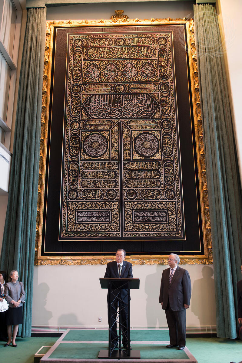 Secretary-General Ban Ki-moon (centre) delivers remarks at the unveiling of the Kiswa of the Holy Kaaba, a gift to the United Nations from the Kingdom of Saudi Arabia. The Kiswa has been re-installed in the Indonesian Lounge at UN Headquarters, following the renovation of the Headquarters complex under the Capital Master Plan (CMP). Looking on is Abdallah Yahya A. Al-Mouallimi (right), Permanent Representative of Saudi Arabia to the UN. Also pictured, Yoo Soon-taek (left), wife of the Secretary-General.