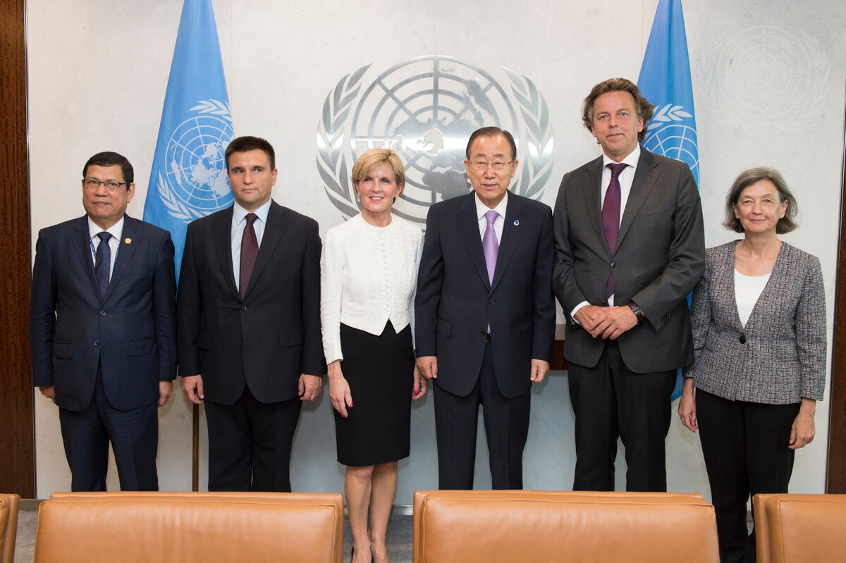 Secretary-General Ban Ki-moon (centre right) meets with the Ministers for Foreign Affairs of Australia, the Netherlands and Ukraine, along with the Permanent Representatives of Belgium and Malaysia. From left: Ramlan Bin Ibrahim, Permanent Representative of Malaysia to the UN; Pavlo Klimkin, Minister for Foreign Affairs of Ukraine; Julie Bishop, Minister for Foreign Affairs of Australia; Albert Koenders, Minister for Foreign Affairs of the Kingdom of the Netherlands; and Bénédicte Frankinet, Permanent Representative of Belgium to the UN. The five countries are sponsoring a draft Security Council resolution establishing an international tribunal to prosecute persons responsible for the downing in July 2014 of Malaysian Airlines Flight MH17 in eastern Ukraine.