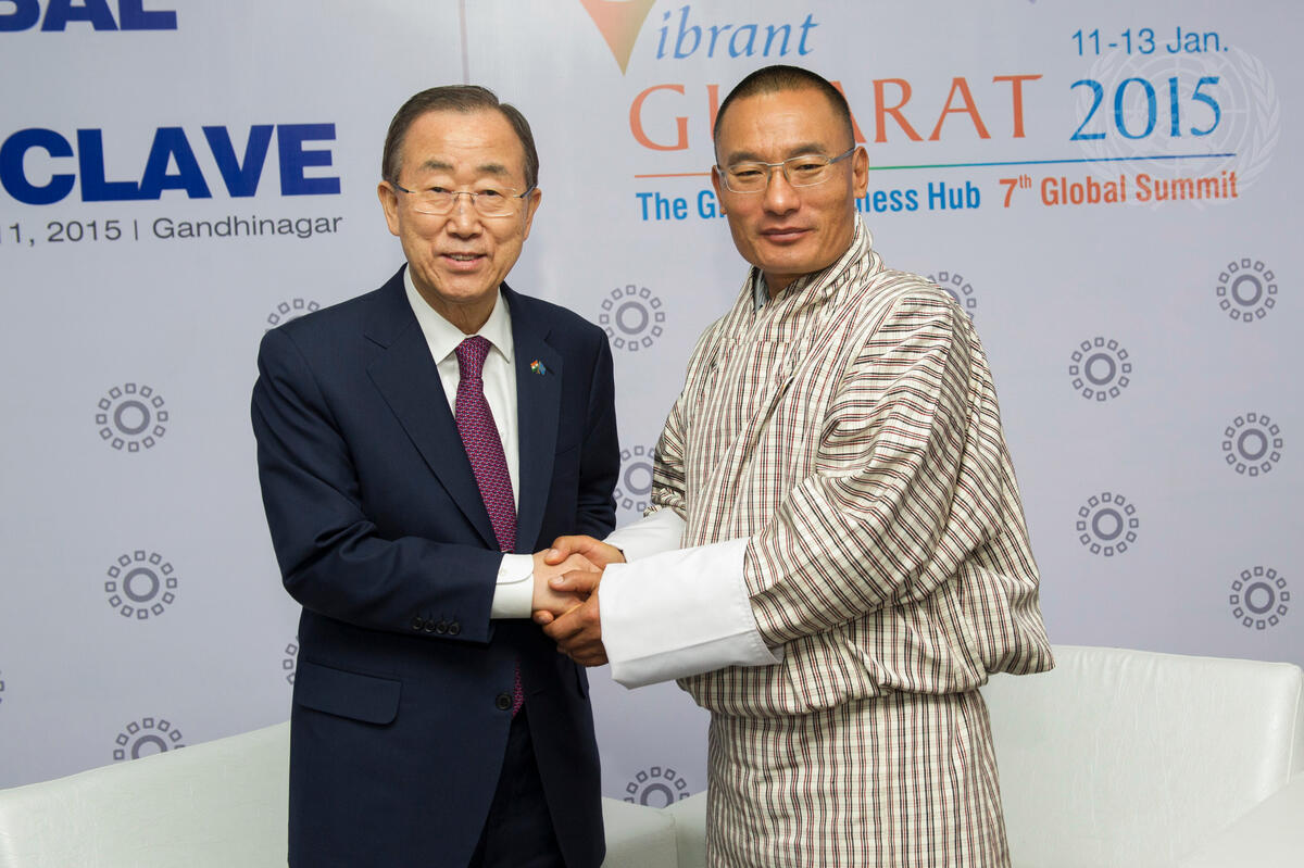 Secretary-General Ban Ki-moon (left) meets with Lyonchoen Tshering Tobgay, Prime Minister of the Kingdom of Bhutan, on the margins of the 7th Vibrant Gujarat Summit in India.