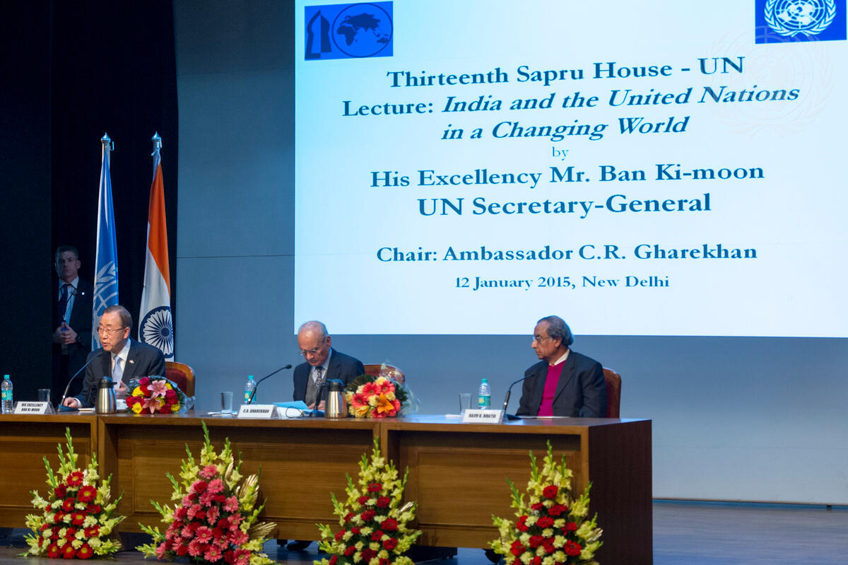 Secretary-General Ban Ki-moon (left) delivering the 13th Sapru House-UN Lecture on ""India and the United Nations in a Changing Word"", hosted by the Indian Council for World Affairs (ICWA). Also pictured: Chairman Ambassador Chinmaya Gharekhan (centre) and Rajiv Bhatia (right) Director General, Indian Council of World Affairs.