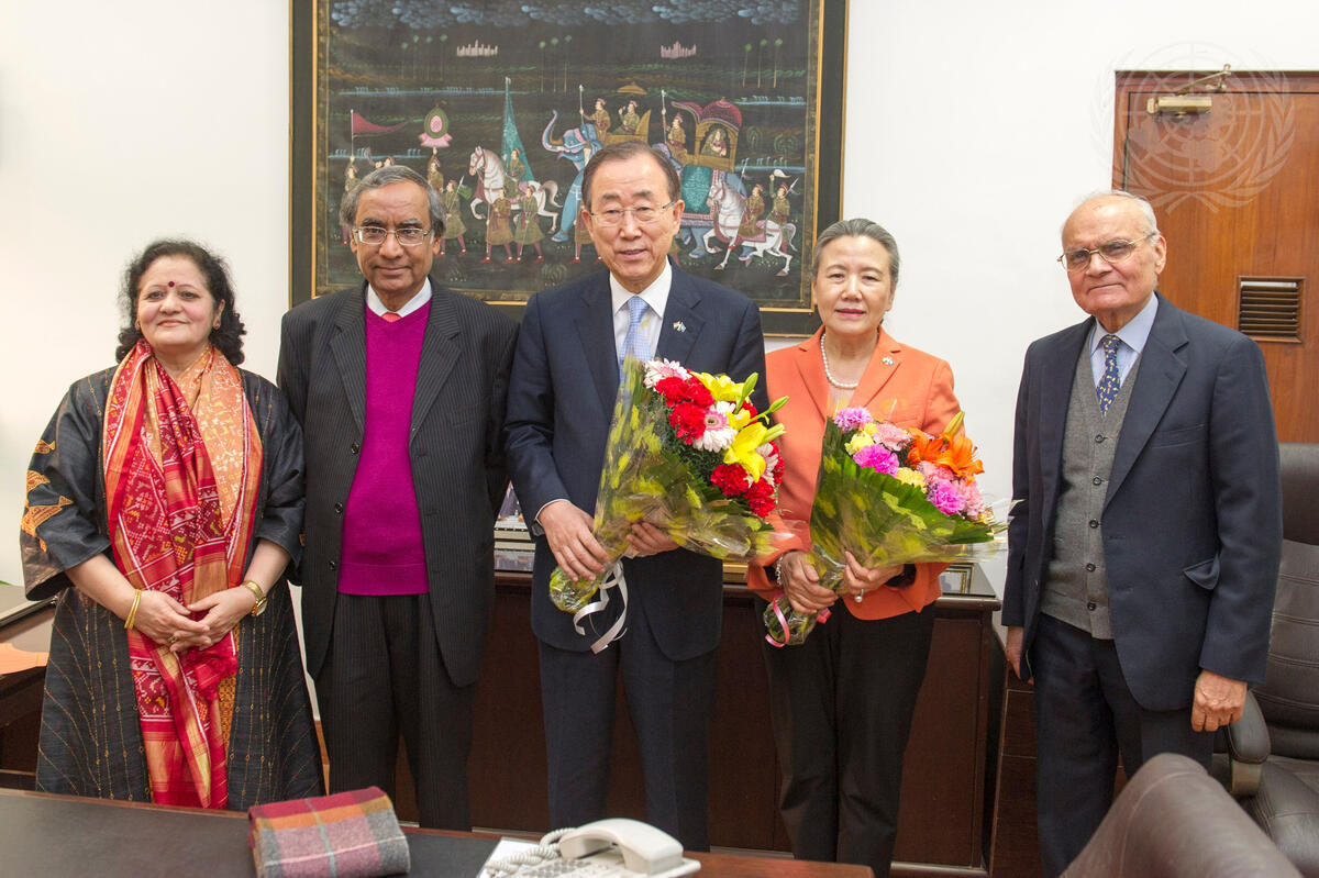 Secretary-General Ban Ki-moon (centre) and his wife, Yoo Soon-taek, meet with Rajiv Bhatia (second from left) Director General, ICWA and Chinmaya Gharekhan (right), former Ambassador and UN official.