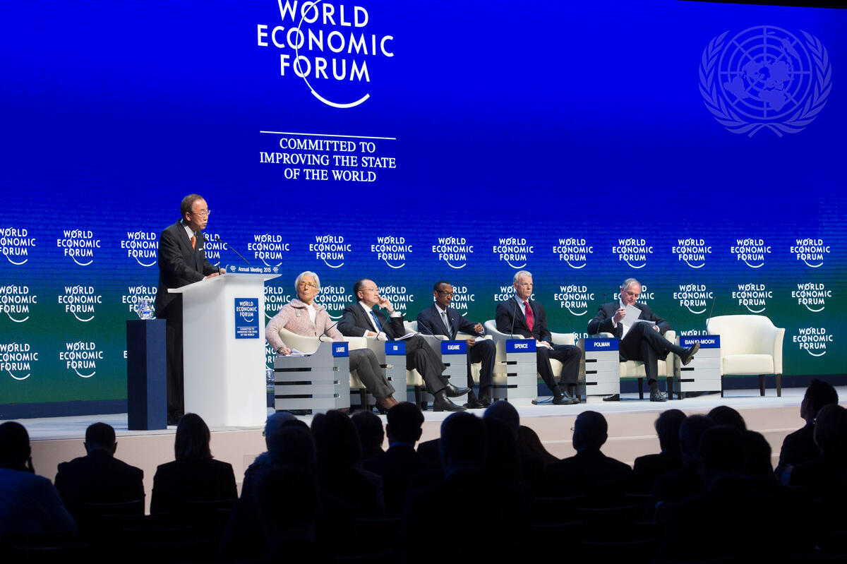 Secretary-General Ban Ki-moon (left) addresses the 2015 World Economic Forum at a session on ""Tackling Climate, Development and Growth"". Other speakers, from left to right: Christine Lagarde, Managing Director of International Monetary Fund; Jim Yong Kim, President of the World Bank; Paul Kagame, President of Rwanda; A. Michael Spence, Professor of NYU Stern School of Business; and Paul Polman, CEOof Unilever.