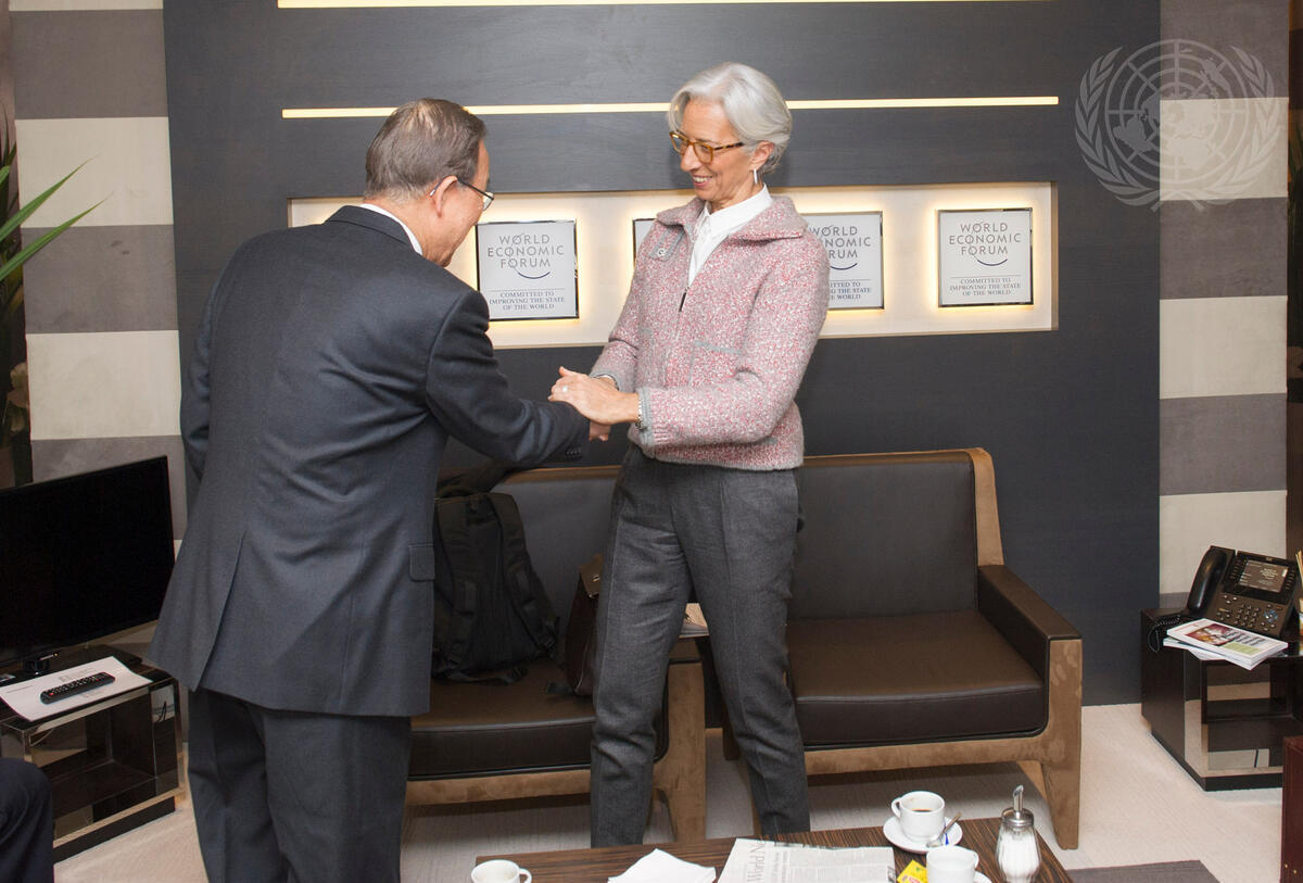 Secretary-General Ban Ki-moon (left) greets Christine Lagarde, Managing Director of International Monetary Fund (IMF).