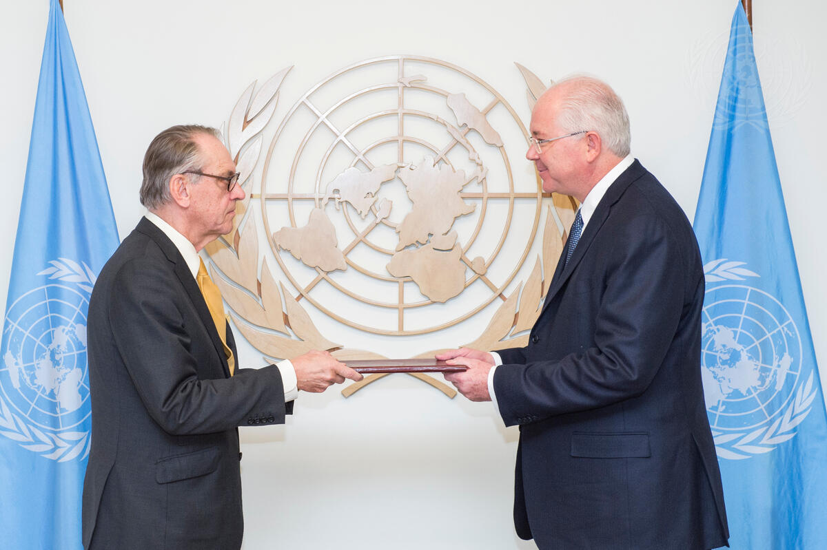 Rafael Darío Ramírez Carreño (right), new Permanent Representative of the Bolivarian Republic of Venezuela to the United Nations, presents his credentials to Deputy Secretary-General Jan Eliasson.
