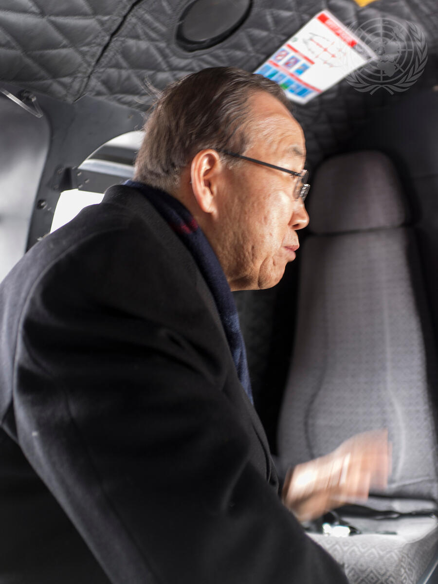 Secretary-General Ban Ki-moon in a helicopter on his way to the World Economic Forum in Davos